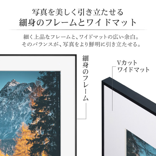 奥行き感のあるフレームは高品質な日本製。コーナー金具のネジをゆるめて短辺から出し入れができる、位置決めのしやすい差し込み式フレームです。Vカットの中抜き加工により額縁に奥行き感を与え、作品をより引き立たせます。