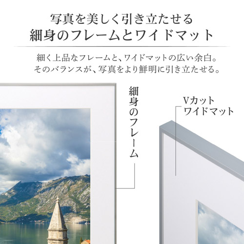 細身のフレームとワイドマットが作品を引き立たせる展示会等に最適なアルミ製額縁です。