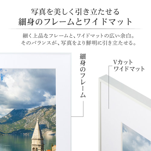 奥行き感のあるフレームは高品質な日本製。コーナー金具のネジをゆるめて短辺から出し入れができる、位置決めのしやすい差し込み式フレームです。Vカットの中抜き加工により額縁に奥行き感を与え、作品をより引き立たせます。