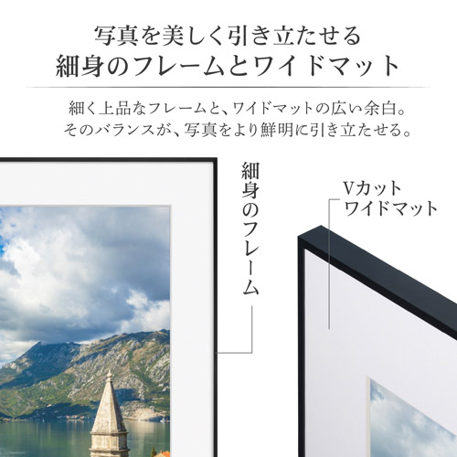 奥行き感のあるフレームは高品質な日本製。コーナー金具のネジをゆるめて短辺から出し入れができる、位置決めのしやすい差し込み式フレームです。Vカットの中抜き加工により額縁に奥行き感を与え、作品をより引き立たせます。