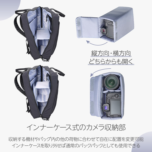 カメラ収納部のインナーケースを取り外せば、カメラを持ち運ばない日も、軽くて使いやすい通常のバックパックとして活躍します。