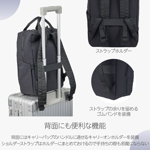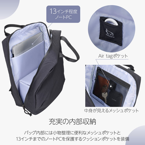 バッグを下ろさずに側面からアクセス可能![]() 標準レンズ付き一眼カメラと、交換レンズ1本の収納が可能。バッグを下ろすことなく側面から素早くカメラにアクセスできます。 インナーケース式のカメラ収納部![]() カメラ収納部は、縦方向、横方向のどちらにも開くインナーケース式です。収納する機材やバッグ内の他の荷物に合わせて自在に配置を変更できます。インナーケースを取り外せば、通常のバックパックとしても使用可能です。 フロント&サイドポケット![]() 大型のフロントポケットは片手でもスムーズに開け閉めできるマグネットロック式を採用。広めのマチで、手帳や雑誌、小型ポーチなど、厚みのあるものもすっきり収まります。側面にはボトルや折り畳み傘の収納に便利なポケットを備えています。 充実の内部収納![]() バッグ内部には小物整理に便利なメッシュポケットと、13インチまでのノートPCを保護するクッションポケットを設けています。メッシュポケット内側の「Chululu」タグは、AirTagなどの紛失防止タグを入れられる隠しポケットになっています。 タウンユースに適した2Way仕様![]() 大きなハンドルが付いているので、手持ちでも快適に持ち運べます。バックパックとしても、手提げバッグとしても使える2WAY仕様は、タウンユースにぴったりです。 背面にも便利機能![]() 背面にはキャリーバッグのハンドルに通せるキャリーオンホルダーを装備。手持ちの際は、ショルダーストラップをホルダーにまとめておけるので、垂れ下がって邪魔になることがありません。さらに、ストラップの余りを留めるゴムバンドも付いているので、どのようなスタイルでもすっきりと持ち運べます 風合いと機能性を兼ね備えた生地![]() コットンのようにさらりとした自然な風合いと、ナイロンならではの軽量性・撥水性・耐久性を兼ね備えたタスランナイロン生地を使用しています。光沢感の少ないマットな質感で、カジュアルなスタイルからアウトドアまで、あらゆるシーンにマッチします。 開閉がスムーズな軽量樹脂ファスナー![]() メイン開口部には、引っかかりが少なくスムーズに開閉できる軽量で丈夫な樹脂製のファスナーを採用。ファスナーを本体生地と同系色にすることで、デザイン性を損なうことなく、統一感のあるすっきりとした見た目に仕上げています。 サイズ![]() 製品構成![]() ・バッグ本体 イメージ![]() 使用イメージ![]() モデル身長155cm(画像はベージュ) 使用イメージ![]() モデル身長155cm(画像はベージュ) 使用イメージ![]() モデル身長155cm(画像はオリーブ) 使用イメージ![]() モデル身長155cm |