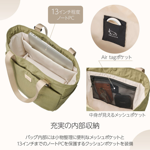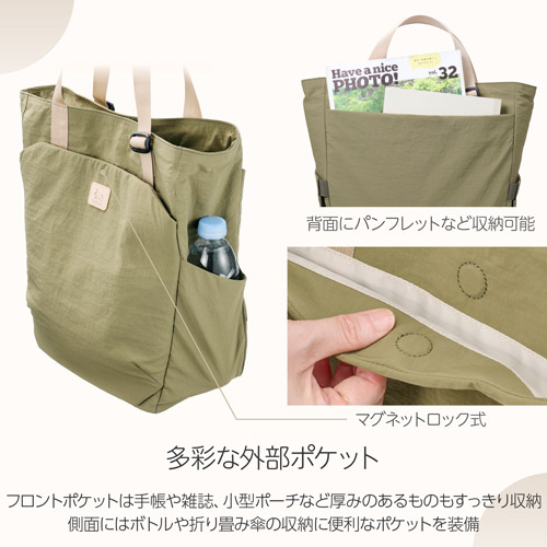 肩掛けも手持ちもできる2Way仕様のトートバッグ![]() アジャスターでハンドルの長さを調整して、手持ちスタイルにもできる2Way仕様のトートバッグです。手持ちでスマートに、肩掛けで両手を空けてと、スタイルやシーンに合わせて持ち方を変えられます。長さ調節で余ったハンドルは、前面と背面のポケットにそれぞれすっきりと収まります。 インナーケース式のカメラ収納部![]() カメラ収納部は、一眼カメラと交換レンズ1本の収納が可能なインナーケースタイプです。縦方向、横方向のどちらにも開くので、収納する機材やバッグ内の他の荷物に合わせて自在に配置を変更できます。インナーケースを取り外して通常のトートバッグとして使用したり、インナーケースをお手持ちのリュックなどで活用したりすることができます。 多彩な外部ポケット![]() 広めのマチがある大型のフロントポケットは、手帳や雑誌、小型ポーチなど、厚みのあるものもスマートに収納できます。背面には、パンフレットや薄い冊子などを入れられるポケットを装備。側面には、ボトルや折りたたみ傘の収納に便利なポケットも備えています。 充実の内部収納![]() バッグ内部には小物整理に便利なメッシュポケットと、13インチまでのノートPCを収納できるクッションポケットを設けています。メッシュポケット内側の「Chululu」タグは、AirTagなどの紛失防止タグを入れられる隠しポケットになっています。 スムーズに開閉できるマグネットロック![]() メイン収納部とフロントポケットは、どちらも片手でもスムーズに開け閉めできるマグネットロック式です。バッグを肩にかけたまま、必要なものをサッと取り出せます。 風合いと機能性を兼ね備えた生地![]() コットンのようにさらりとした自然な風合いと、ナイロンならではの軽量性・撥水性・耐久性を兼ね備えたタスランナイロン生地を使用しています。光沢感の少ないマットな質感で、カジュアルなスタイルからアウトドアまで、あらゆるシーンにマッチします。 サイズ![]() 製品構成![]() ・バッグ本体 イメージ![]() 使用イメージ![]() モデル身長175cm 使用イメージ![]() モデル身長155cm(画像はブラック) 使用イメージ![]() モデル身長155cm |