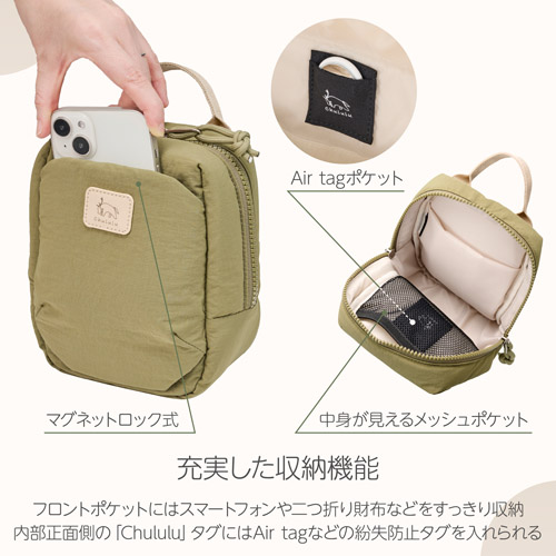 カメラと必要最小限のアイテムをコンパクトに収納![]() コンパクトカメラや小型ミラーレス一眼カメラを、スマートフォンやお財布などと一緒にシンプルに持ち運ぶのに最適なサイズです。程よいクッション性があり、かさばらずに安心してカメラを持ち運べます。カメラを持ち運ばない日も、必要最小限の身の回りアイテムをコンパクトに収納し、身軽にお出かけするのに便利です。 サッと出し入れできるフロントポケット![]() 広めのマチがあるフロントポケットには、スマートフォンや二つ折りの財布など、厚みのあるものもすっきりと収納できます。片手でもスムーズに開け閉めできるマグネットロック式なので出し入れも簡単です。 内部メッシュポケット![]() 内部には、鍵やイヤホンなど、小物の収納に便利なメッシュポケットを備えています。メッシュポケット内側の「Chululu」タグは、AirTagなどの紛失防止タグを入れられる隠しポケットになっています。 用途が広がる着脱式ショルダーベルト![]() ショルダーベルトは体形に合わせて長さ調節が可能で、フックで簡単に着脱できます。ベルトを取り外せば、お手持ちのリュックなどに入れてインナーバッグとしても活用できます。 風合いと機能性を兼ね備えた生地![]() コットンのようにさらりとした自然な風合いと、ナイロンならではの軽量性・撥水性・耐久性を兼ね備えたタスランナイロン生地を使用しています。光沢感の少ないマットな質感で、カジュアルなスタイルからアウトドアまで、あらゆるシーンにマッチします。 開閉がスムーズな軽量樹脂ファスナー![]() メイン開口部には、引っかかりが少なくスムーズに開閉できる軽量で丈夫な樹脂製のファスナーを採用。ファスナーを本体生地と同系色にすることで、デザイン性を損なうことなく、統一感のあるすっきりとした見た目に仕上げています。 サイズ![]() イメージ![]() 使用イメージ![]() モデル身長155cm(画像はブラック) 使用イメージ![]() モデル身長155cm 使用イメージ![]() モデル身長155cm(画像はブラック) 使用イメージ![]() モデル身長155cm(画像はベージュ)  |