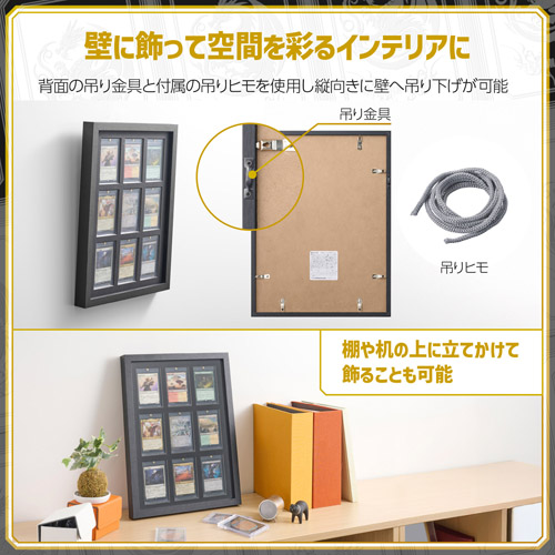 マグネットローダー35ptにジャストサイズ設計![]() カードを傷や汚れから保護するマグネットローダーの中でも一般的に利用される35ptサイズ(外寸:約W73×H110×D7mm)に合わせたジャストサイズ設計。中額に配置された、ローダーがぴったりと収まる窓に最大9枚のコレクションを美しく額装できます。 コレクションを引き立てる中額構造![]() 中額の表側には高級感のある厚手のマット紙を採用。窓抜き部分の切り口を斜めに裁断する「Vカット加工」により、額装したカードの周囲に美しい立体感が生まれ、コレクションを際立たせます。さらに、裏側には厚手のEVAクッションを採用。ローダーを優しく包み込み、予期せぬ傷や衝撃から大切なカードをしっかりと保護します。 壁に飾って空間を彩るインテリアに![]() フレーム背面に設置された金具と付属の吊りヒモを使用し、縦向きに壁へ吊り下げて飾ることができます。壁に飾ることで、お気に入りのコレクションが鑑賞しやすくなり、お部屋のインテリアとして空間を彩ります。また、フレームの厚みを利用して、棚や机の上に立て掛けて飾ることも可能です。 重厚感を演出する木製ブラックフレーム![]() どんなインテリアのお部屋にも馴染みやすいシンプルで重厚感のあるマットブラック調の木製フレームを採用しています。フレーム、マット紙、EVAクッションをブラックに統一することで、額縁が主張しすぎることなくトレーディングカードのデザインをアート作品のように引き立てます。 割れにくいアクリル板を採用![]() 前面板には、安全性が高く割れにくいアクリル板を採用。ガラス製と違い、万が一の落下時でも破損の心配が少なく安心です。また、アクリル板は素材自体の特性として、室内紫外線(UV)の多くをカットする効果があり、大切なトレーディングカードの色褪せや劣化リスクの軽減に役立ちます。 フレーム形状イメージ![]() 製品サイズ![]() 製品仕様![]() 使用イメージ![]() 使用イメージ![]() パッケージ![]() 付属品一式![]() ・木製フレーム |