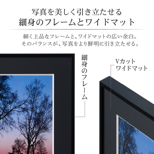 奥行き感のあるフレームは高品質な日本製。コーナー金具のネジをゆるめて短辺から出し入れができる、位置決めのしやすい差し込み式フレームです。Vカットの中抜き加工により額縁に奥行き感を与え、作品をより引き立たせます。