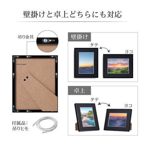 付属品の吊りヒモと裏面の吊り金具を使用して壁掛けでの使用が可能です。背面には、タテ置き、ヨコ置きどちらでも飾れる折りたたみ式のスタンドも付いています。