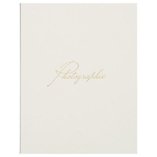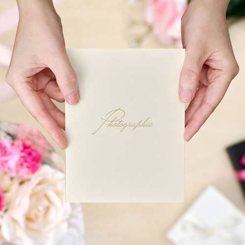 写真やメッセージは、差し込むだけで簡単にセット可能な差し込みタイプ。表紙には「写真」を意味するフランス語「Photographie」を筆記体でシンプルにあしらい、洗練された美しさと気品を纏った特別なカードに仕上げました。