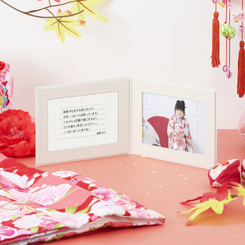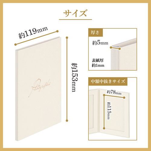 感謝の想いを伝えたい様々なシーンに![]() ちょっとしたお礼から、誕生日のお祝いや旅立つ友人へのメッセージ、出産祝いのお返しや内祝い、結婚祝いのお礼、退職時のお別れなど、心を込めた感謝を伝える様々な場面でご活用いただけます。カードの洗練されたデザインは、感謝の気持ちをより一層上品に伝えます。 カードを贈るシーン例:結婚式![]() 結婚式の開催を支援をしてくださったご両親やご親戚へ、式当日の特別な写真に、今までの感謝の気持ちを綴ったメッセージカードを添えて贈ることで、記念に残る特別な贈り物となります。(画像は2Lサイズ タテ) カードを贈るシーン例:出産・内祝い![]() 無事に赤ちゃんが誕生した喜びと、いただいたお祝いへの心からの感謝を伝える内祝いに。生まれたばかりの赤ちゃんの写真とお名前や成長の報告を添えたメッセージが、受け取った方の記憶に深く残る、特別な内祝いを演出します。(画像はLサイズ タテ) カードを贈るシーン例:七五三![]() 日頃から温かく見守ってくださる祖父母やご親戚へ、七五三のお参り当日の晴れ着写真と、成長への感謝のメッセージを添えて贈ることで、喜びの気持ちをより一層深く伝えられ、お子様にとって大切な節目を心に残る特別な形で残すことができます。(画像はLサイズ ヨコ) カードを贈るシーン例:退職・送別![]() 退職される上司、異動される同僚・先輩へ、思い出の写真や送別会で撮影した集合写真などに心を込めたメッセージを添えて贈ることで、長年にわたる感謝と新たな門出を祝う気持ちを、心に残る形で伝えることができます。(画像は2Lサイズ ヨコ) 熟練の技が光る一枚一枚に込めたこだわり![]() 国内工場で熟練の職人が一枚ずつ丁寧に仕上げた上質なフォトメッセージカード。機械には出せない繊細な風合いと、手づくりならではの温もりが、贈る方の真心を伝える特別な一枚となり、贈り物の価値をさらに引き立てます。 しなやかで柔らかい上質なタント紙を使用![]() 表面に控えめな凹凸のエンボス加工が施された高級感ただよう上質なタント紙を使用しています。手に取った際にしなやかで柔らかく、その質感から特別な想いを感じ取ることができます。 汎用性の高いシンプルなメッセージカード付き![]() 写真ポケットにぴったり収まるサイズのシンプルな手書きメッセージカードが付属。無駄な装飾を省いた罫線のみのデザインを採用しているため、フォーマルからカジュアルまで様々なシーンでご使用いただけます。 差し込むだけで簡単にセット![]() 写真とメッセージカードを差し込むだけで簡単にセットできる差し込みタイプ。のりやテープなどは一切不要で入れ替えもカンタンです。2面とも写真をセットすることも可能。贈るシーンや伝えたい想いに合わせて、自由に組み合わせることができます。 写真を引き立てる中額仕様![]() 中額にはほどよい厚みがあり、セットした写真やカードをしっかりと保持しながら、上質な雰囲気を漂わせます。開いた瞬間に想いが伝わる美しい仕上がりです。 気品あふれる表紙デザイン![]() 表紙にはフランス語で「写真」を意味する「Photographie」を筆記体で、控えめにかつ印象深くあしらいました。洗練された美しさと気品を纏い、贈る相手に上質感を伝えるエレガントなデザインに仕上げました。 サイズ![]() Lサイズの写真をタテ向きに2枚収納可能。折りたたみ時の厚さは約5mmです。 パッケージ![]() |