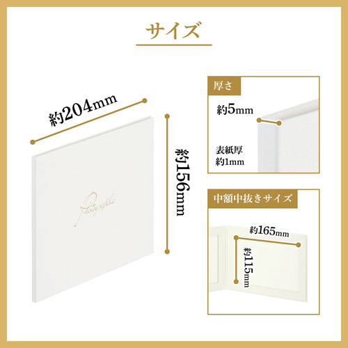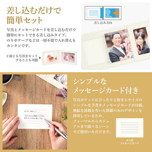 感謝の想いを伝えたい様々なシーンに![]() ちょっとしたお礼から、誕生日のお祝いや旅立つ友人へのメッセージ、出産祝いのお返しや内祝い、結婚祝いのお礼、退職時のお別れなど、心を込めた感謝を伝える様々な場面でご活用いただけます。カードの洗練されたデザインは、感謝の気持ちをより一層上品に伝えます。 カードを贈るシーン例:結婚式![]() 結婚式の開催を支援をしてくださったご両親やご親戚へ、式当日の特別な写真に、今までの感謝の気持ちを綴ったメッセージカードを添えて贈ることで、記念に残る特別な贈り物となります。(画像は2Lサイズ タテ) カードを贈るシーン例:出産・内祝い![]() 無事に赤ちゃんが誕生した喜びと、いただいたお祝いへの心からの感謝を伝える内祝いに。生まれたばかりの赤ちゃんの写真とお名前や成長の報告を添えたメッセージが、受け取った方の記憶に深く残る、特別な内祝いを演出します。(画像はLサイズ タテ) カードを贈るシーン例:七五三![]() 日頃から温かく見守ってくださる祖父母やご親戚へ、七五三のお参り当日の晴れ着写真と、成長への感謝のメッセージを添えて贈ることで、喜びの気持ちをより一層深く伝えられ、お子様にとって大切な節目を心に残る特別な形で残すことができます。(画像はLサイズ ヨコ) カードを贈るシーン例:退職・送別![]() 退職される上司、異動される同僚・先輩へ、思い出の写真や送別会で撮影した集合写真などに心を込めたメッセージを添えて贈ることで、長年にわたる感謝と新たな門出を祝う気持ちを、心に残る形で伝えることができます。(画像は2Lサイズ ヨコ) 熟練の技が光る一枚一枚に込めたこだわり![]() 国内工場で熟練の職人が一枚ずつ丁寧に仕上げた上質なフォトメッセージカード。機械には出せない繊細な風合いと、手づくりならではの温もりが、贈る方の真心を伝える特別な一枚となり、贈り物の価値をさらに引き立てます。 しなやかで柔らかい上質なコースター紙を使用![]() 表面に控えめな凹凸のエンボス加工が施された高級感ただよう上質なコースター紙を使用しています。手に取った際にしなやかで柔らかく、その質感から特別な想いを感じ取ることができます。 汎用性の高いシンプルなメッセージカード付き![]() 写真ポケットにぴったり収まるサイズのシンプルな手書きメッセージカードが付属。無駄な装飾を省いた罫線のみのデザインを採用しているため、フォーマルからカジュアルまで様々なシーンでご使用いただけます。 差し込むだけで簡単にセット![]() 写真とメッセージカードを差し込むだけで簡単にセットできる差し込みタイプ。のりやテープなどは一切不要で入れ替えもカンタンです。2面とも写真をセットすることも可能。贈るシーンや伝えたい想いに合わせて、自由に組み合わせることができます。(画像はLサイズ) 写真を引き立てる中額仕様![]() 中額にはほどよい厚みがあり、セットした写真やカードをしっかりと保持しながら、上質な雰囲気を漂わせます。開いた瞬間に想いが伝わる美しい仕上がりです。 気品あふれる表紙デザイン![]() 表紙にはフランス語で「写真」を意味する「Photographie」を筆記体で、控えめにかつ印象深くあしらいました。洗練された美しさと気品を纏い、贈る相手に上質感を伝えるエレガントなデザインに仕上げました。 サイズ![]() 2Lサイズの写真をヨコ向きに2枚収納可能。折りたたみ時の厚さは約5mmです。 パッケージ![]() |